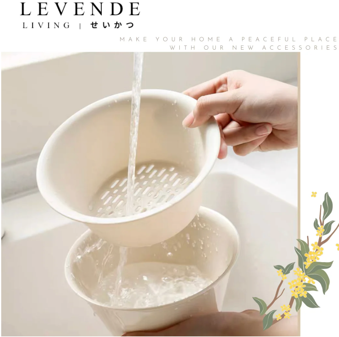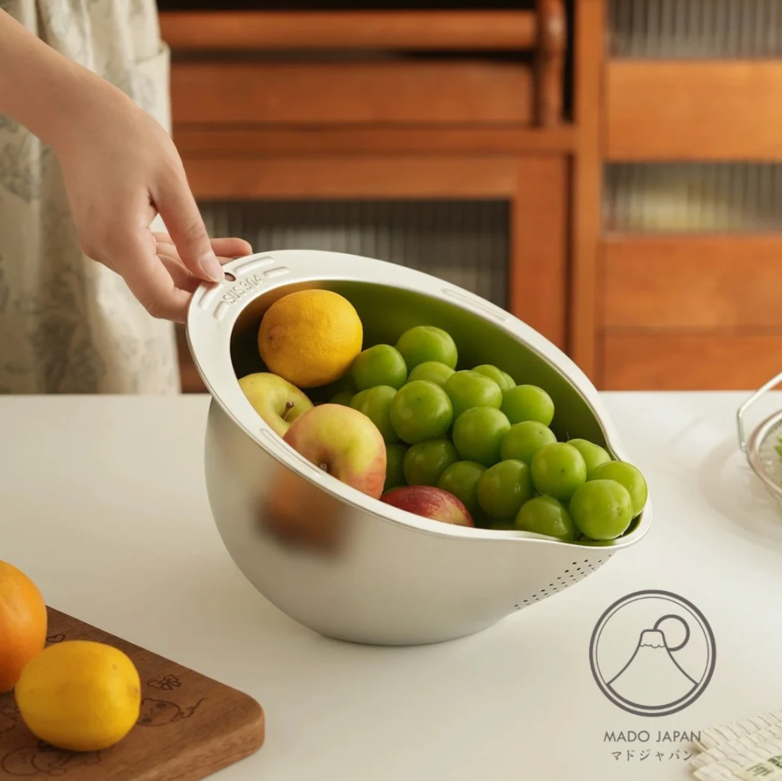 A well-organized kitchen with a variety of dishes stacked on a wall-mounted shelf. Glassware hangs upside down beneath the shelf, and several kitchen utensils are neatly arranged. A rice cooker, some containers, and cooking tools are on the countertop. The background features white subway tiles, adding to the clean and organized aesthetic.